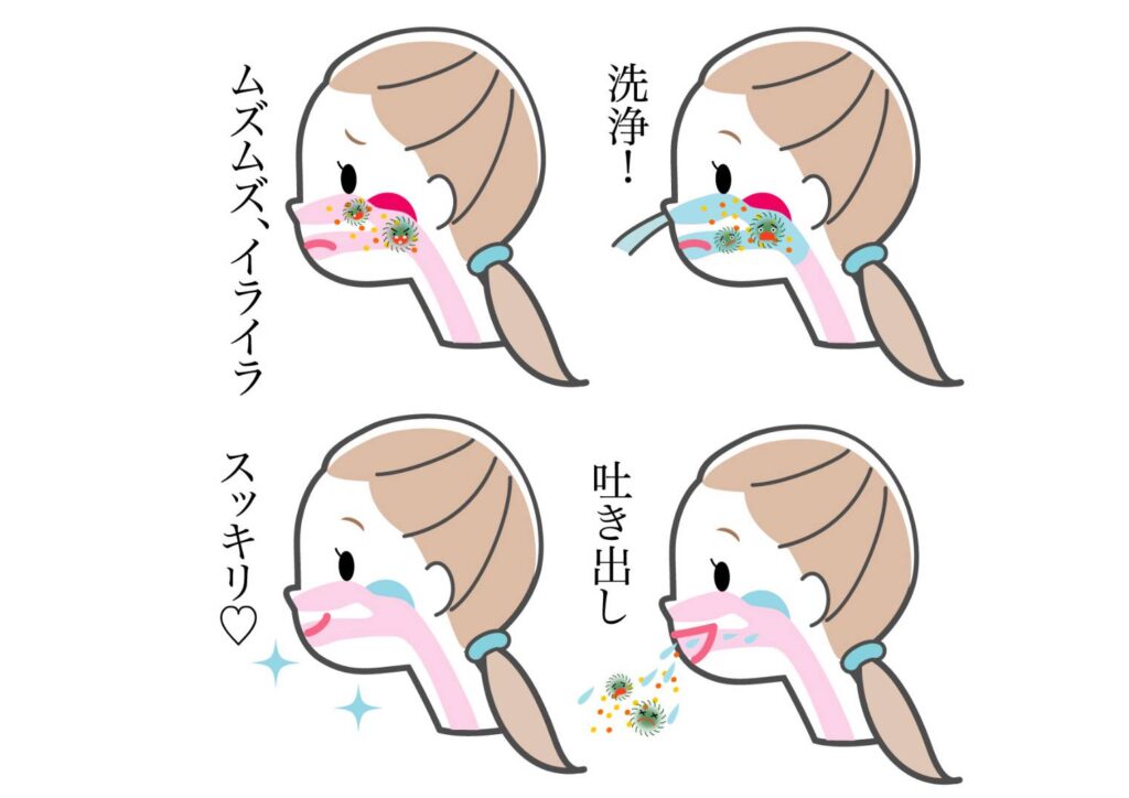 鼻うがいには鼻の中に付着しているウイルスや細菌、花粉やハウスダストを洗い流したり、鼻詰まりの解消、喉の炎症予防など、様々な効果があります。