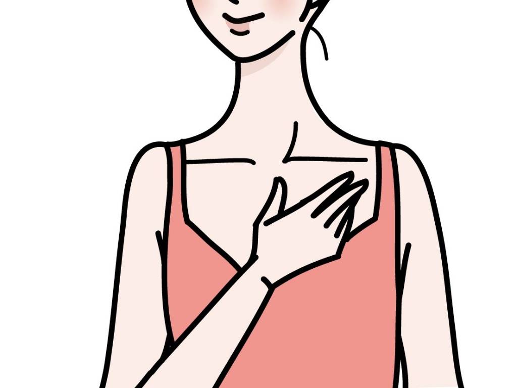 1. 左の鎖骨下に右の指先をあてます。軽く圧をかけながらくるくると筋肉をほぐしていきます。最初は真ん中あたりから徐々に外側へ。