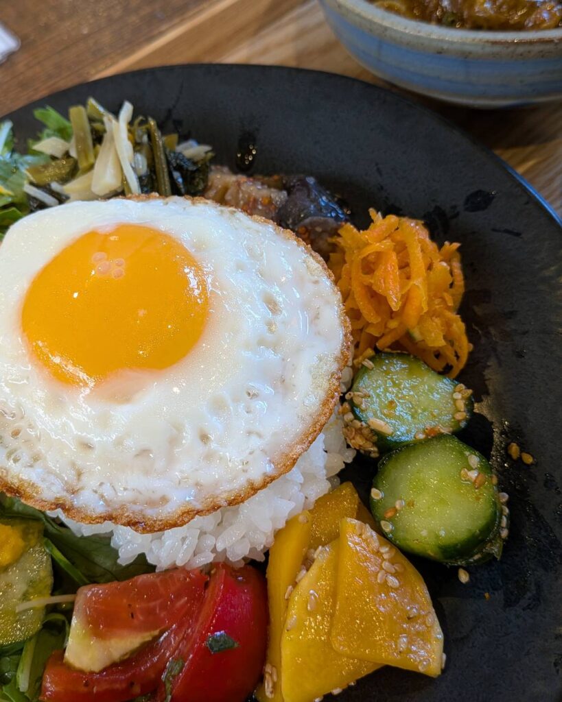 一緒に盛られてくるお惣菜がこれまたカラフルで味付けもそれぞれシンプルながら個性的で、目にも舌にも彩り豊かな一皿でした。